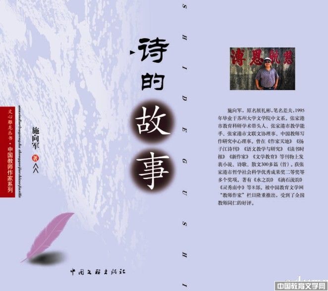 施向軍(1974.3~),男,漢族,張家港人。本名展禮彬,筆名差夫。1995年畢業(yè)于蘇州大學(xué)文學(xué)院中文系,本科。曾在江蘇省張家港市南豐中學(xué)任教10年。張家港市教育科研學(xué)術(shù)帶頭人、張家港市教學(xué)能手、張家港市文聯(lián)文協(xié)理事。在《作家天地》《揚(yáng)子江詩刊》《語文教學(xué)與研究》《讀書時(shí)報(bào)》《新作家》《文學(xué)教育》等國內(nèi)多家刊物上發(fā)表小說、詩歌、散文等300多篇(首)。在《語文教學(xué)與研究》(全國中文核心期刊)、《現(xiàn)代語文》《創(chuàng)新作文》《成才之路》等刊物上發(fā)表教育教學(xué)論文60多篇,獲獎30多篇,有5篇論文被中國人民大學(xué)資料復(fù)印中心《中學(xué)語文教與學(xué)》全文轉(zhuǎn)載。論文被人民教育出版社網(wǎng)、中國知識資源庫、中國語文教育網(wǎng)、河南教育科研網(wǎng)、寶山教育信息網(wǎng)、常州圖書館、上海新中高級中學(xué)、上海七寶中學(xué)等網(wǎng)站和學(xué)校錄用。在張家港市人民政府主辦的張家港市哲學(xué)社會科學(xué)優(yōu)秀成果評比中獲二、三等獎。出版有詩集《水之韻》(黑龍江人民出版社),校本教材《滴石流韻》(中國文聯(lián)出版社)和《靈秀南中》(中國文聯(lián)出版社)。主編或參編《綜合實(shí)踐活動》《初中作文新題導(dǎo)解與示范》《中考作文訓(xùn)練題設(shè)計(jì)》等教科書和教輔書8部。曾獲張家港市教育科研先進(jìn)個(gè)人、張家港市優(yōu)秀團(tuán)干部、張家港市新長征突擊手、張家港市文藝先進(jìn)工作者等稱號。參與蘇州市教育局“九五”立項(xiàng)課題“中華傳統(tǒng)美德與四有新人之間的關(guān)系”,現(xiàn)已結(jié)題。主持蘇州市教育局“十五”立項(xiàng)課題“教師教育能力與學(xué)生能力發(fā)展間的相關(guān)性研究”現(xiàn)已結(jié)題。參加國家哲學(xué)社會科學(xué)規(guī)劃領(lǐng)導(dǎo)小組和教育部社政司批準(zhǔn)的“十五”課題“素質(zhì)教育與校園文學(xué)研究”,于2005年7月在京圓滿結(jié)題。本人被評為課題研究優(yōu)秀實(shí)驗(yàn)教師,主編的課題研究成果被評為課題研究優(yōu)秀成果特等獎。參與蘇州市教育局“十五”立項(xiàng)課題“新課程背景下提升教師素質(zhì)的策略研究”的研究,現(xiàn)已取得階段性成果。主持中央教育科學(xué)研究所“十五”重點(diǎn)課題“中小學(xué)生作文個(gè)性化發(fā)展研究”子課題“學(xué)生作文個(gè)性化發(fā)展之小學(xué)、初中銜接研究”,現(xiàn)已取得階段性成果。在中央教育科學(xué)研究所、中國少年兒童新聞出版總社、團(tuán)中央《中學(xué)生》雜志主辦的“葉圣陶杯”全國中學(xué)生新作文大賽中獲作文教學(xué)優(yōu)秀成果獎,輔導(dǎo)學(xué)生孫麗娟等同學(xué)獲一等獎多個(gè)。在中共蘇州市委宣傳部、蘇州市教育局、共青團(tuán)蘇州市委聯(lián)合舉辦的暑期青少年優(yōu)秀作品網(wǎng)絡(luò)競賽中,輔導(dǎo)沈琦、陳濤等多位滴石文學(xué)社社員分獲散文組、詩歌組二等獎。另外,輔導(dǎo)學(xué)生在全國性的“新世紀(jì)杯”“新作文杯”“讀寫杯”等作文比賽中獲獎100多人次。2005年10月,被中國教師寫作研究中心主辦的中國教師文學(xué)網(wǎng)(現(xiàn)改版為“中國教育文學(xué)網(wǎng)”)“教師作家”欄目隆重推出,受到了全國教師的熱烈歡迎和好評。