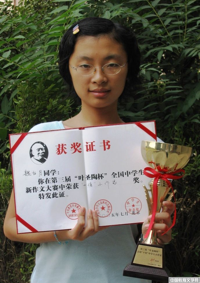 進(jìn)入高中,由于寫作才能突出及較強(qiáng)的個人能力,魏古月被選為校“弘遠(yuǎn)文學(xué)社”主要負(fù)責(zé)人之一。文學(xué)社的廣闊天地,為她提供了舞臺,寫作水平更上層樓。在2005年第三屆“葉圣陶杯”作文大賽中,她不負(fù)重望,代表襄樊賽區(qū)參加“全國十佳小作家”的角逐,最終捧回了“十佳小作家”的獎杯。她的事跡也在《楚天都市報》和《襄樊日報》進(jìn)行了熱烈的報道。