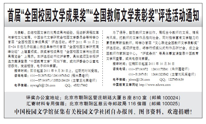 首屆“全國校園文學(xué)成果獎”(不收評審費)將在論壇期間舉行頒獎儀式。頒發(fā)校園文學(xué)實踐先進單位獎、社團報刊獎、教學(xué)成果獎、研究成果獎、創(chuàng)作成果獎、校園文學(xué)新苗獎、校園文學(xué)事業(yè)貢獻獎等獎項。首次表彰“全國示范文學(xué)校園”,推出“文學(xué)校園”品牌學(xué)校。同時舉辦全國校園文學(xué)社團成果展覽會。經(jīng)申報評選獲獎的各地優(yōu)秀校園文學(xué)社團進行成果展覽與自辦報刊交流。
