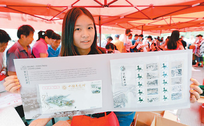 6月23日,為慶祝中國大運(yùn)河申遺成功,中國集郵總公司發(fā)行的《運(yùn)河十景名家書畫》個性化郵票及杭州市郵票公司發(fā)行的 《中國大運(yùn)河申遺成功》紀(jì)念封在杭州首發(fā)。其中《運(yùn)河十景名家書畫》個性化郵票1組兩版,共20枚,主圖為“馬踏飛燕”,附圖圖案選自當(dāng)代書畫名家曾宓、 王冬齡、孔仲起、吳山明等有關(guān)杭州“運(yùn)河十景”的書畫作品?!吨袊筮\(yùn)河申遺成功》紀(jì)念封一套3枚,紀(jì)念封郵票選用2009年發(fā)行的“京杭大運(yùn)河拱宸橋特 種郵票”,限量發(fā)行2萬套。