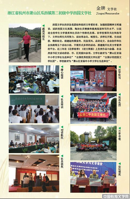 浙江省杭州市蕭山區(qū)瓜瀝鎮(zhèn)第二初級中學(xué)瀝園文學(xué)社于2010年11月10日創(chuàng)建,現(xiàn)有社員108名。其宗旨是團(tuán)結(jié)和組織文學(xué)愛好者,加強(qiáng)校園精神文明建設(shè),活躍校園文化氛圍,陶冶社員情操和提高閱讀和寫作水平,以促進(jìn)全校學(xué)生文學(xué)素質(zhì)和社員的個性特色發(fā)展。在學(xué)校領(lǐng)導(dǎo)關(guān)注和指導(dǎo)下,文學(xué)社師生共同努力,活動常態(tài)化、制度化、多樣化開展,生動活潑,精彩紛呈。組建起傳媒宣傳、民俗采風(fēng)、品詩論文、自由創(chuàng)作和社會實踐等五個活動小組,開展諸如山水采風(fēng)、走向社區(qū)、聽講座、參加演講比賽、開辦“瀝園之聲”校園廣播、學(xué)做志愿者等形式多樣的活動,開設(shè)了課文劇創(chuàng)作、晨讀校本課程、采薇校本閱讀、采薇創(chuàng)客、文學(xué)課堂等課程。還聘請專家擔(dān)任《瀝園》顧問,搭建提升社員文學(xué)素養(yǎng)的平臺。瀝園文學(xué)社已取得顯著的成績。近三年在《花季雨季》《語文周報》上發(fā)表作品70 余篇,在各類讀書征文活動獲省、市、區(qū)獎勵30 余項。瀝園文學(xué)社于2013年5月被評為蕭山區(qū)首屆中小學(xué)文學(xué)社團(tuán);2013年12月獲得“全國優(yōu)秀校園文學(xué)社團(tuán)”稱號,并評出了優(yōu)秀校長朱偉炳、優(yōu)秀指導(dǎo)教師修云輝、優(yōu)秀社長李千紅;2014年11月再次榮獲“ 全國優(yōu)秀校園文學(xué)社”稱號;2015年11月,獲“全國示范校園文學(xué)社團(tuán)”稱號,并評出了模范校長戚再興、模范指導(dǎo)教師修云輝。瓜瀝二中還被評為蕭山區(qū)首屆中小學(xué)文學(xué)社先進(jìn)單位。2015年第六卷《文學(xué)校園》草橋卷以“金牌文學(xué)?!睂谶M(jìn)行了社團(tuán)展示。